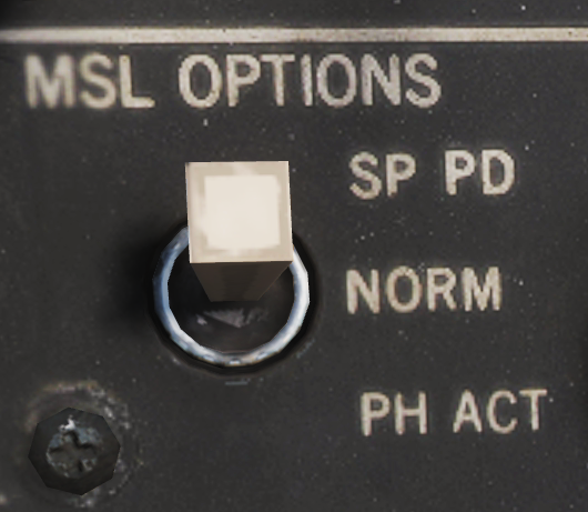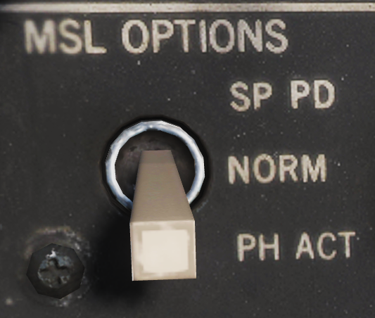 按下武器选择开关会将选定的武器从 SP 切换至 PH,反之亦然。如果武器控制系统有 STT 目标,那么,除非在 ACM 面板的 MSL MODE(导弹模式)开关上选择 BRSIT(瞄准轴),否则 WCS 将自动使用正常模式进行发射。所有其他情况下将使用瞄准轴模式发射导弹。